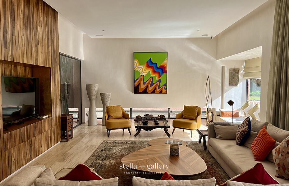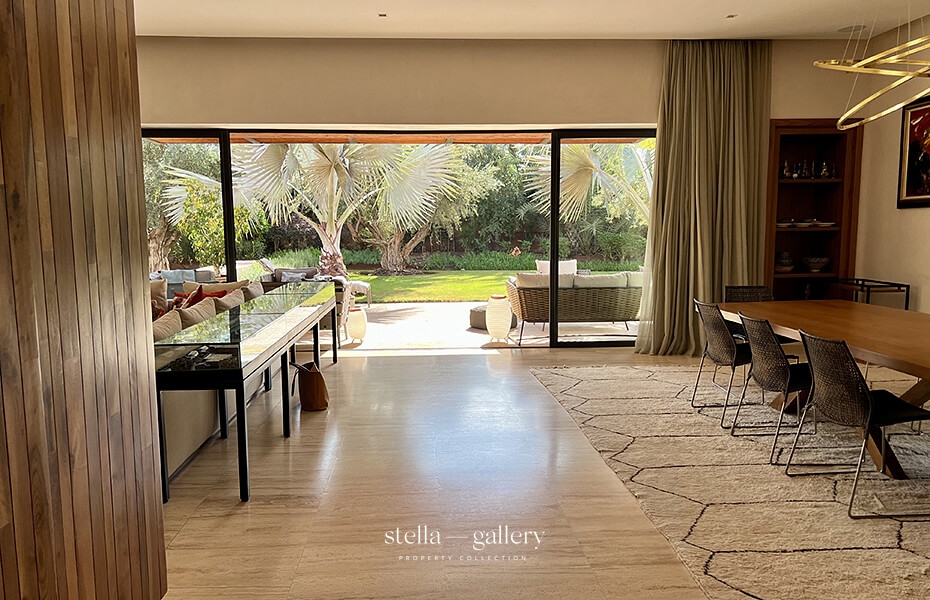 La villa s’ouvre sur un vaste espace de vie réunissant salon avec cheminée et salle à manger, largement ouverts sur la piscine.