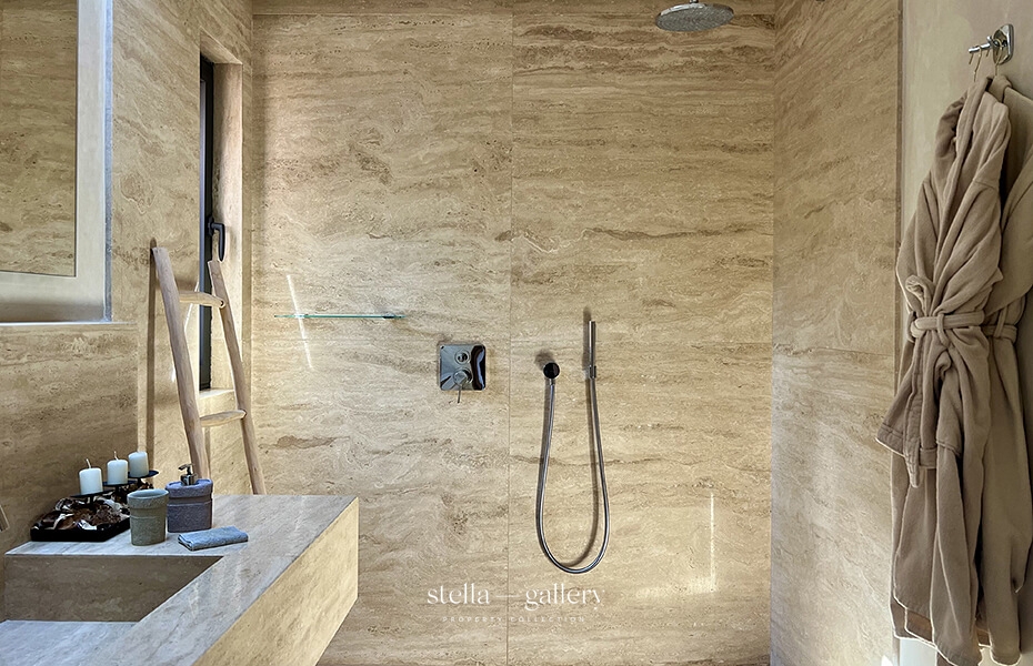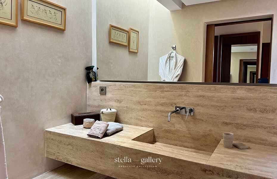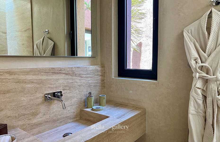 À l’intérieur, la villa comprend quatre chambres, chacune avec sa salle de bain attenante, un vaste salon avec cheminée ainsi qu’une cuisine lumineuse et entièrement équipée. Le chauffage et le rafraîchissement par le sol, complétés par une climatisation réversible dans toute la maison, garantissent un confort optimal en toute saison.