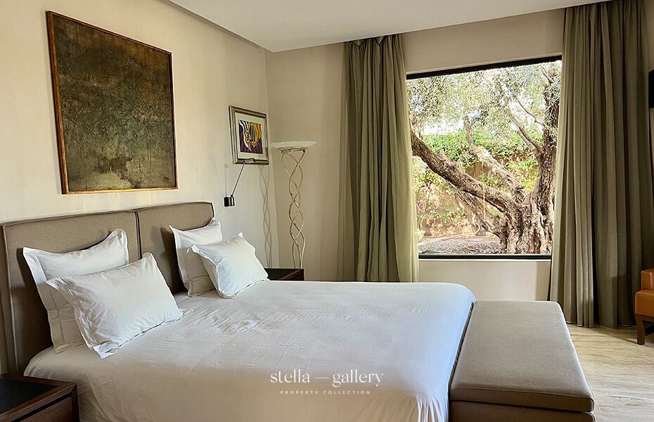 À l’extérieur, la villa s’inscrit dans un parc paysagé de 2 250 m² ponctué d’oliviers tricentenaires, offrant une atmosphère rare et authentique.