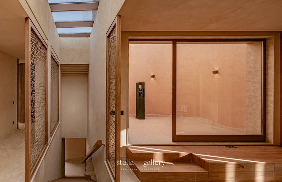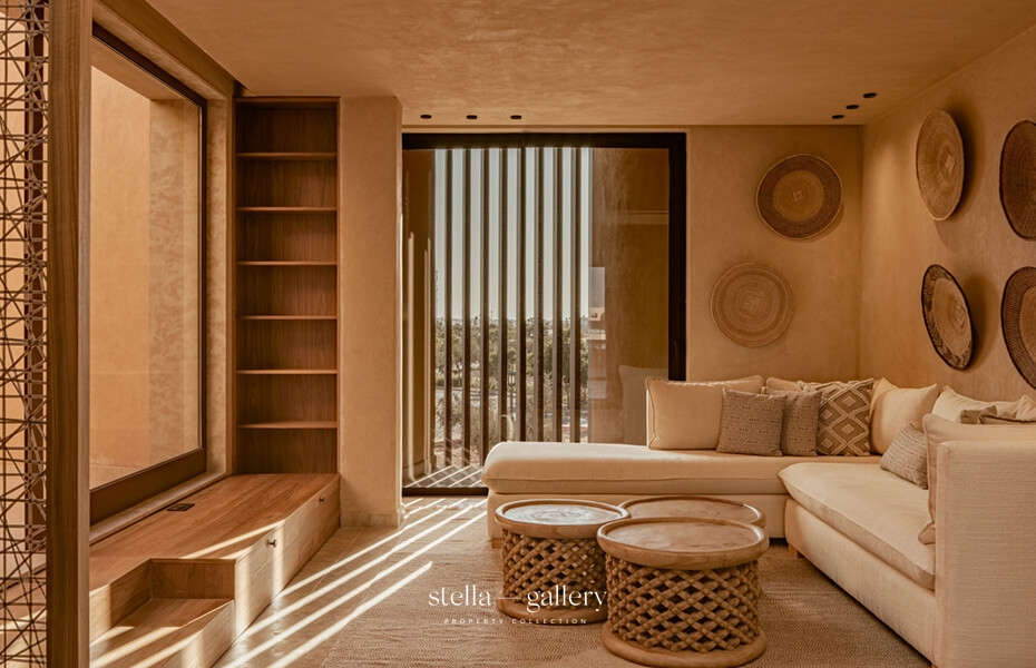 La réception avec cheminée s’ouvre largement sur une vaste terrasse couverte, la piscine, le golf et un jardin soigneusement paysagé. La salle à manger, avec bar en zellige et claustras esprit moucharabieh, apporte une signature chaleureuse et raffinée. Confort en toute saison grâce au chauffage/rafraîchissement par le sol. La villa est proposée entièrement meublée, pour une installation immédiate.