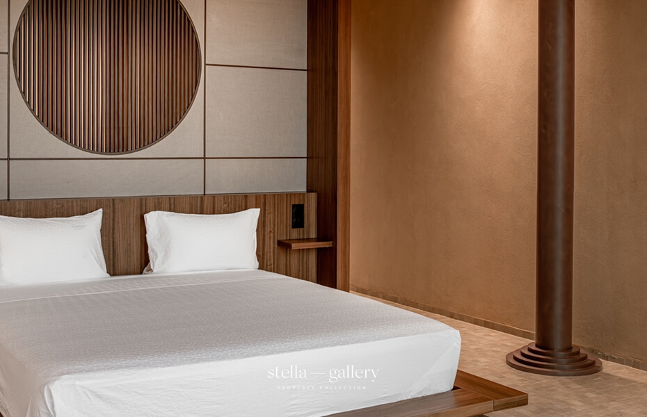 Cette suite élégante bénéficie d’une salle de bain attenante et s’ouvre, grâce à de larges baies vitrées, sur une spacieuse terrasse offrant une vue exceptionnelle sur la nature et le golf.