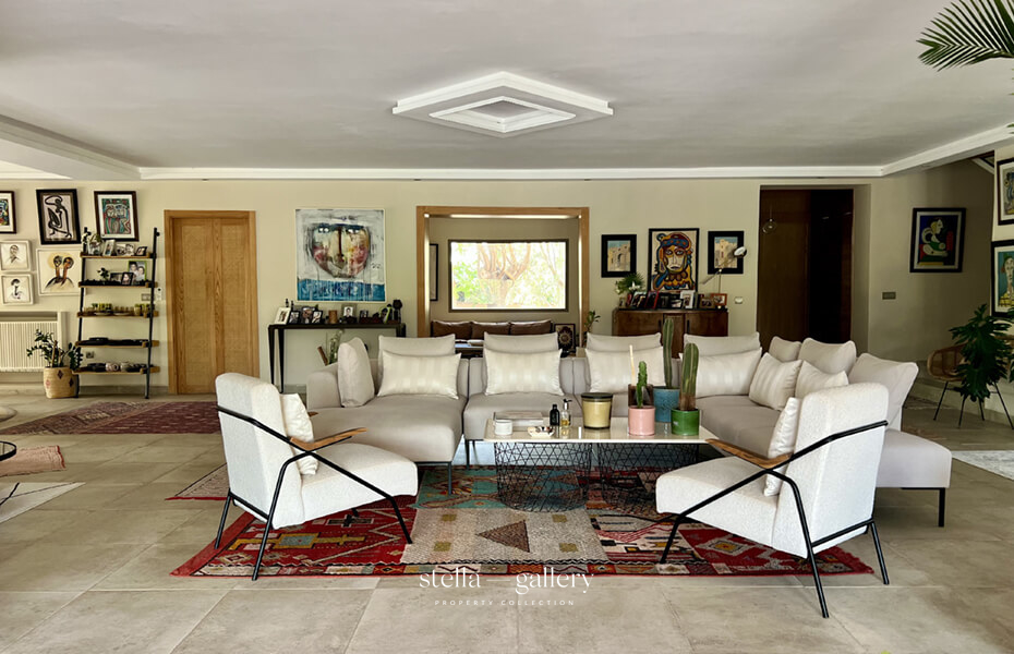 Au rez-de-chaussée, la villa dispose d’une triple réception, baignée de lumière naturelle grâce à de larges baies vitrées, qui s’ouvre sur une grande terrasse et une piscine, créant un espace de vie intérieur-extérieur fluide et harmonieux.