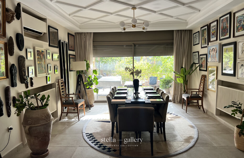 L’espace de réception est complété par une belle salle à manger et une cuisine entièrement équipée, avec un office attenant, idéale pour les repas en famille ou les réceptions.