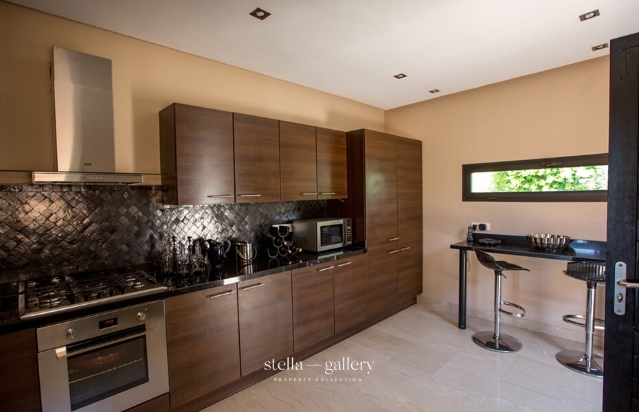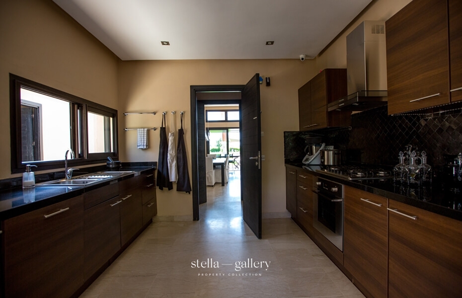 Construite en « L » autour de la piscine, la villa se compose d’un vaste salon / salle à manger avec cheminée et d’un salon TV distinct, tous deux largement ouverts sur la piscine et le jardin, ainsi que d’une cuisine entièrement équipée, pensée pour un usage simple et fluide.