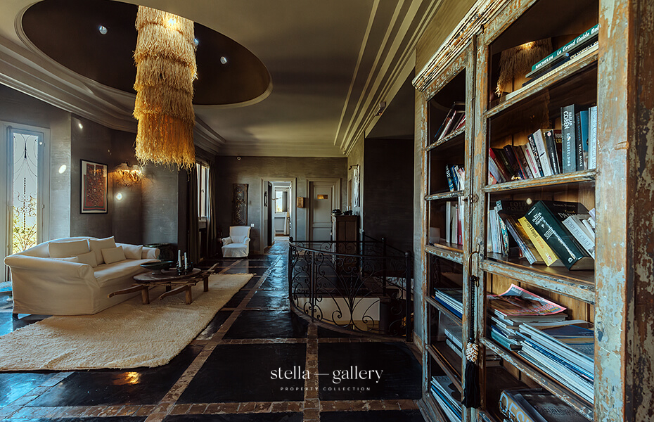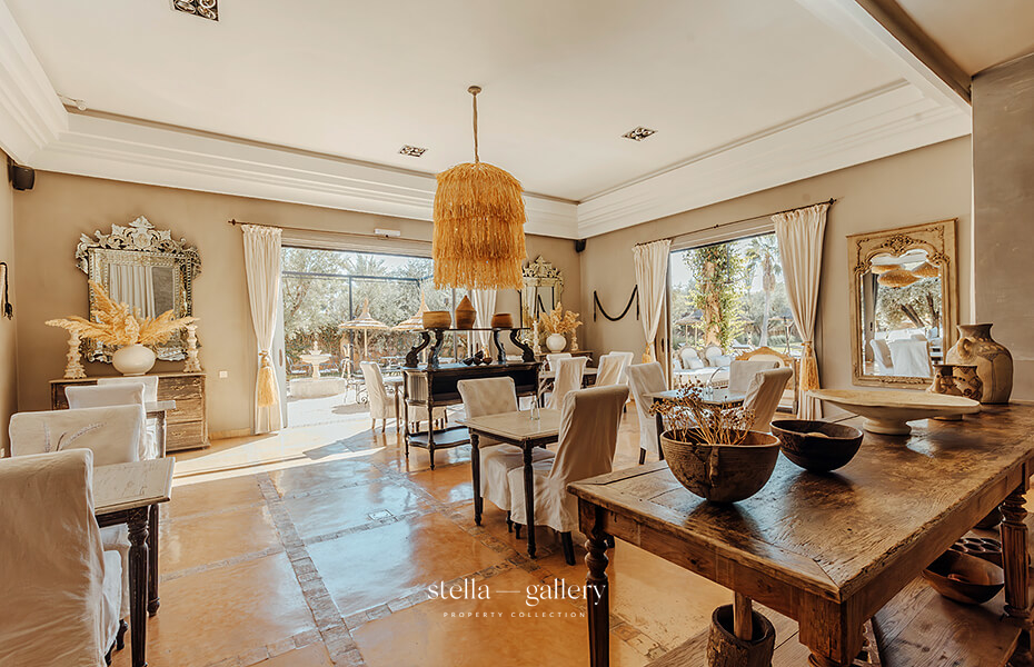 Cette villa conjugue le goût des propriétaires pour la décoration, leur quête permanente pour faire rimer élégance et confort. Tout a été pensé dans un esprit chaleureux qui résulte d’un équilibre judicieux entre meubles anciens, couleurs douces et matériaux naturels faisant la part belle à l’artisanat riche de Marrakech. Les volumes sont généreux : un grand espace de vie vous accueille : un salon majestueux, un bar, un salon cheminée ainsi qu’une salle à manger pouvant accueillir jusqu’à 22 personnes.