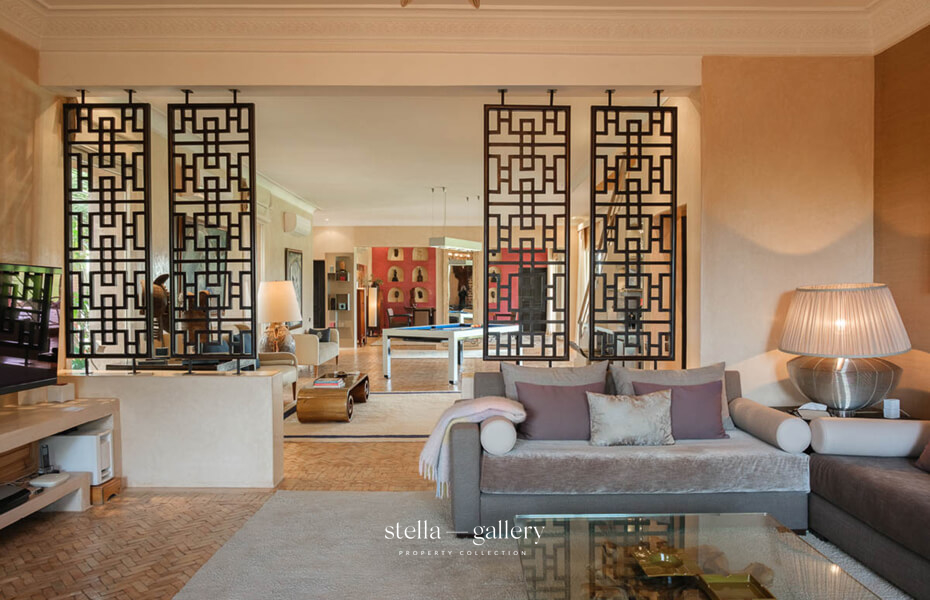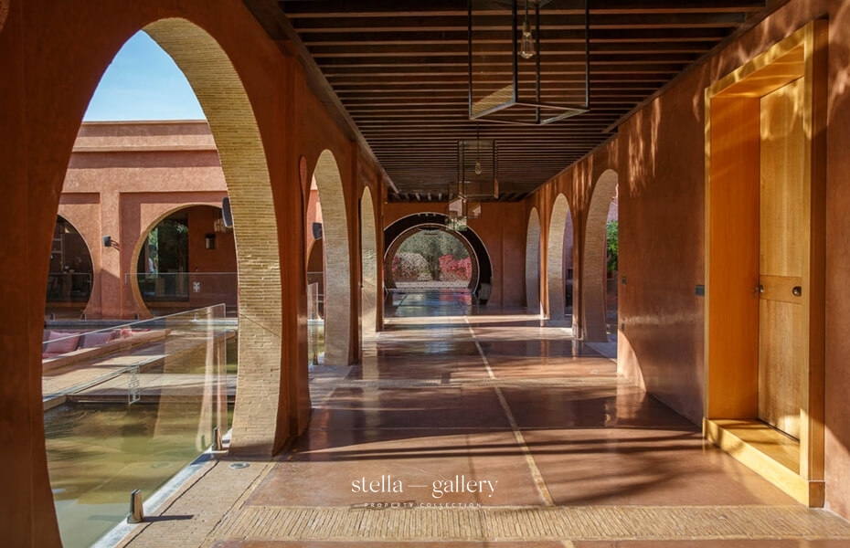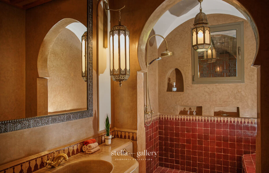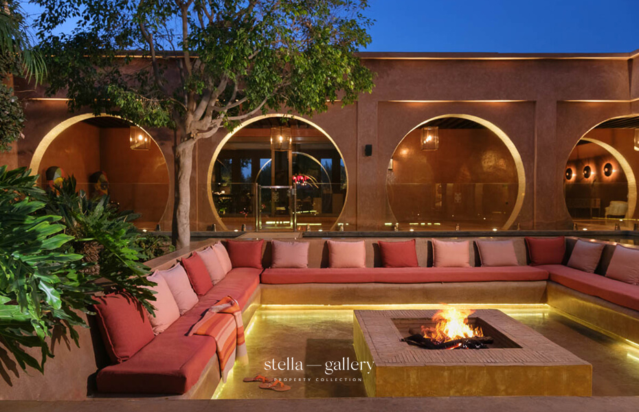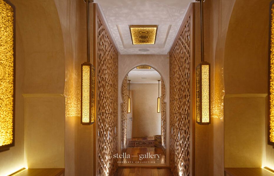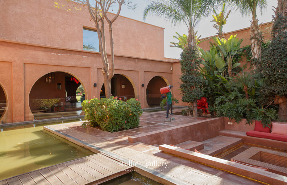 House 1 is built around a calming patio, the true heart of the home, where the gentle sound of water mingles with the delicate scents of orange blossom and roses. Spacious living areas – garden-facing lounges, billiard room, library with fireplace and XL football table, and a private cinema – strike a perfect balance between conviviality and intimacy. The traditional hammam, generous in size and refinement, is worthy of the finest palace spas, while a clay tennis court and shaded garden corners offer moments of leisure or quiet reflection.