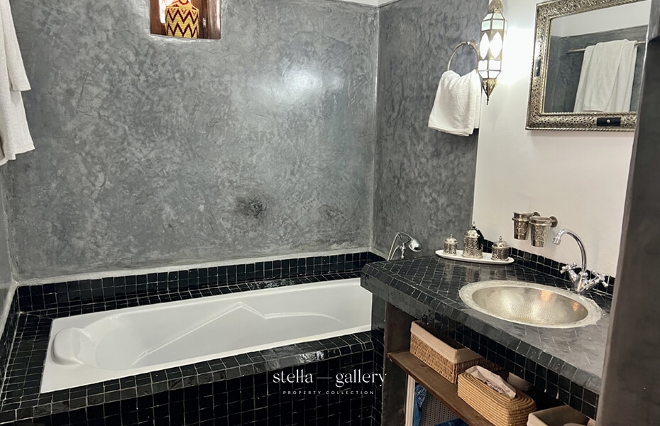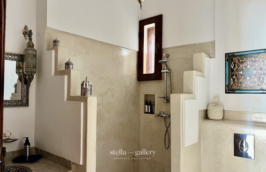 Upstairs, the riad offers four bedrooms, each with its own en-suite bathroom. The principal bedroom features a large bathroom with bathtub, further enhancing the feeling of a private residence.